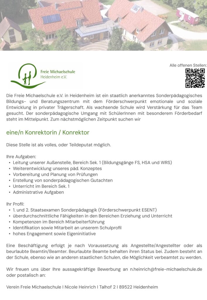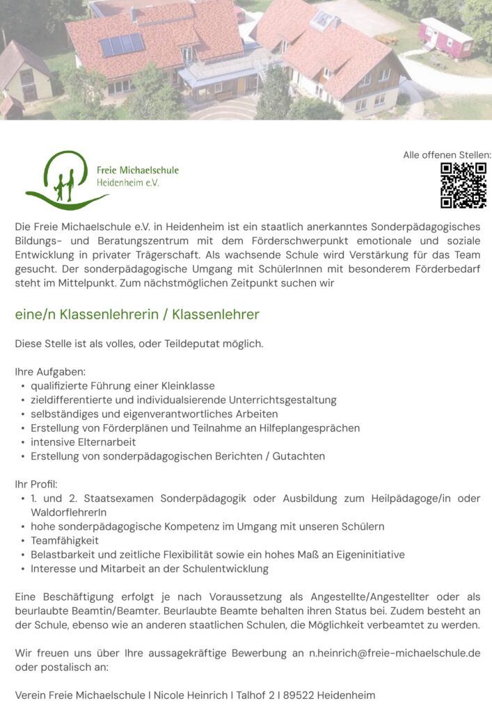 Der Verein Freie Michaelschule Heidenheim e.V. hat zum nächstmöglichen Zeitpunkt folgende Stellen zu besetzen: