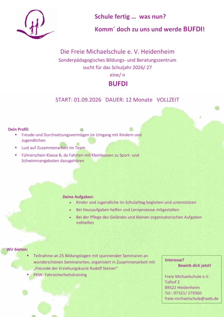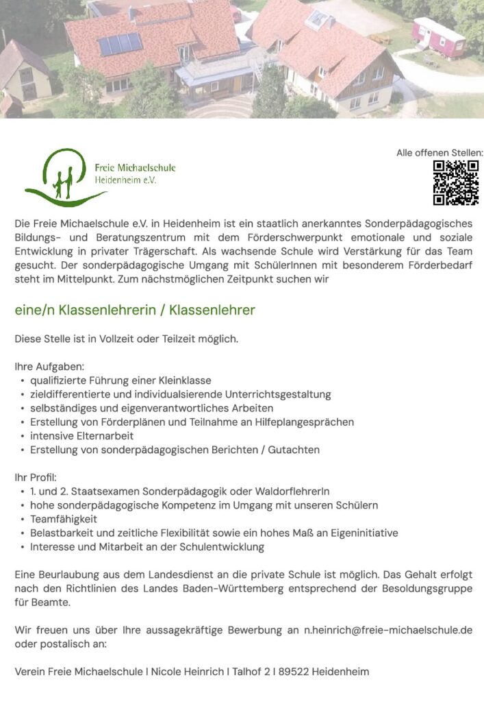 Der Verein Freie Michaelschule Heidenheim e.V. hat zum nächstmöglichen Zeitpunkt folgende Stellen zu besetzen: